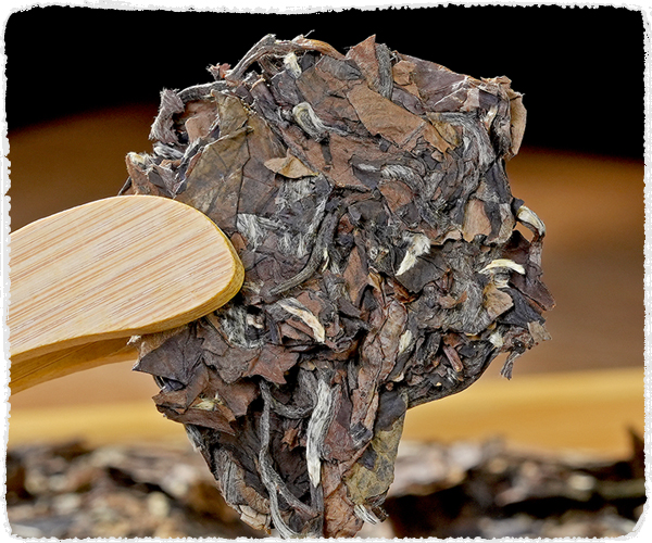 Son aspect est typique du style Shou Mei, avec d'épais filaments couverts d'un duvet blanc et une couleur aux nuances jaunes et brunes. |