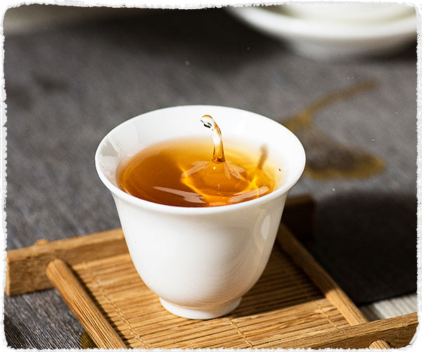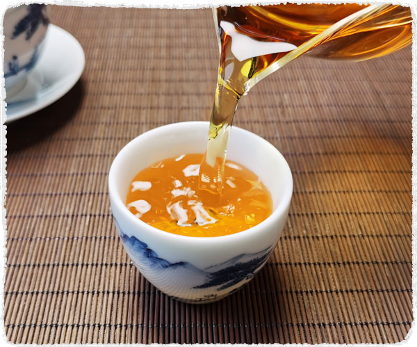 La couleur et l’odeur de l’infusion sont classiques d’un DianHong : rouge orangé et cacaotée avec des notes fleuries apportées par les Chrysanthème. |